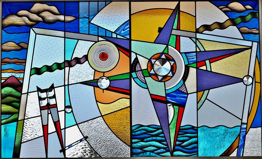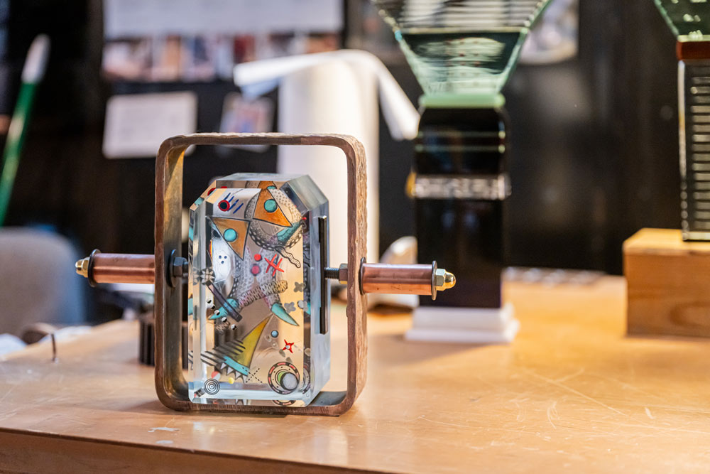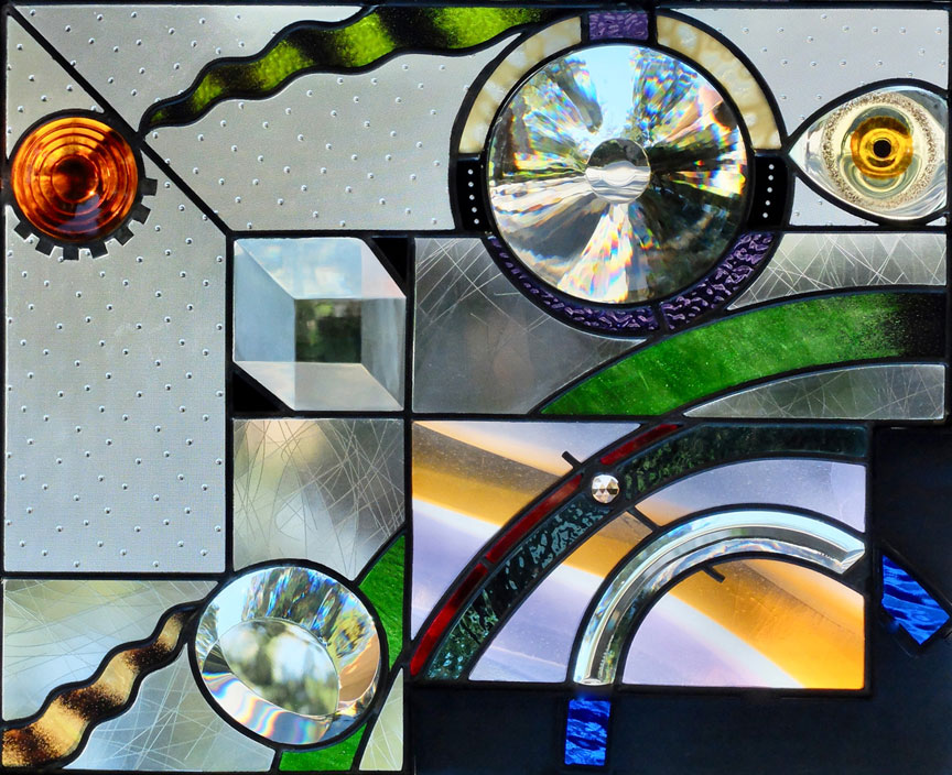 From residential stained glass projects to complete glass environments for public buildings, Powell uses innovative beveling techniques to transform the art of glass into a visually kinetic experience. His stained glass artwork and glass sculptures feature multi-faceted shapes that form optical and geometric illusions, surprising the viewer with an invitation for a closer inspection.