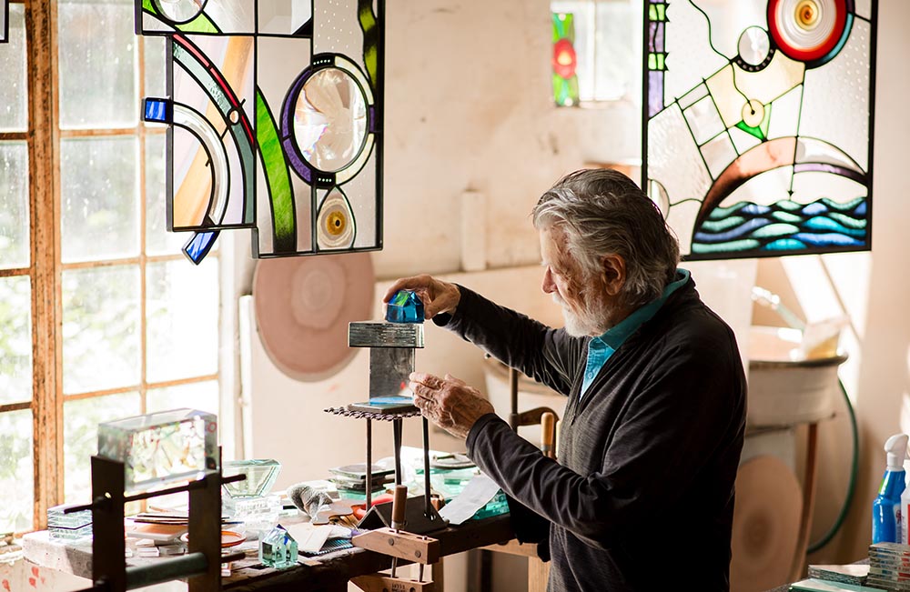 Carl Powell has been a resident artist at Grovewood Village since 1999. A National Endowment for the Arts fellowship recipient, he has been working with glass since the 1970s.