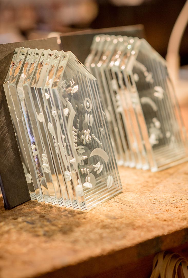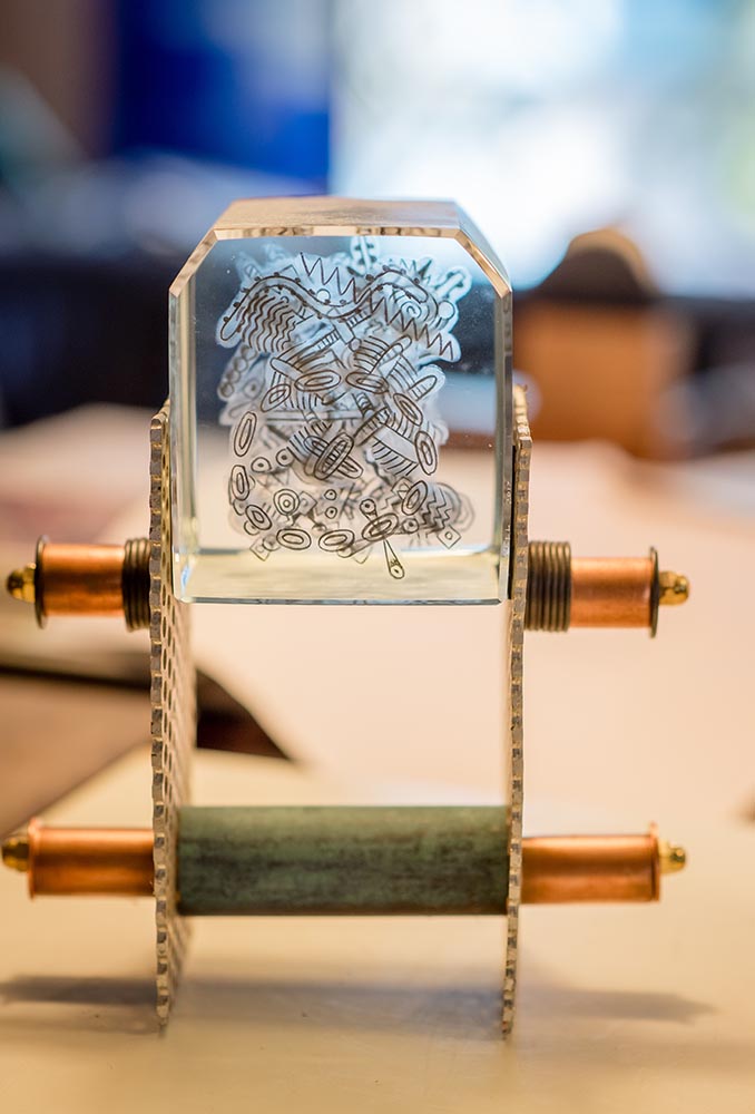 Powell’s work ranges from residential stained glass to large-scale public installations. Using innovative beveling techniques, his glass sculptures and windows create multi-faceted shapes that form optical and geometric illusions, inviting viewers to look closer and explore hidden details.