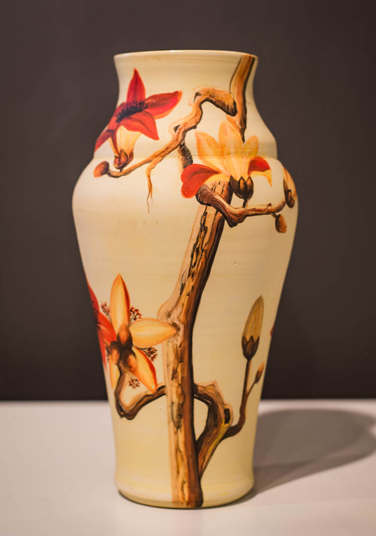 This wheel-thrown ceramic vase by Leslie Green Guilbault offers a soft, vintage-inspired elegance. Finished in a warm cream glaze, its smooth surface provides a serene backdrop for Guilbault’s hand-painted branch and floral bud motif—simple, expressive lines that evoke the quiet poetry of early spring. Subtle variations in tone lend the piece a gently aged character, making it feel timeless yet distinctly handcrafted. Graceful and versatile, it brings an understated natural beauty to any space.