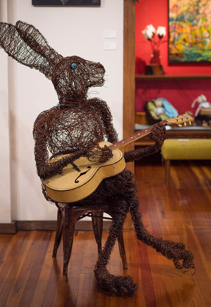 Django Reinhare by Josh Coté is a whimsical fusion of music, nostalgia, and masterful craftsmanship. A wire-sculpted hare—meticulously hand-woven with nothing more than pliers, patience, and imagination—perches on a vintage chair, strumming a real antique guitar. The result is a playful tribute to the legendary Django Reinhardt, reimagined through Coté’s signature lens of wonder.