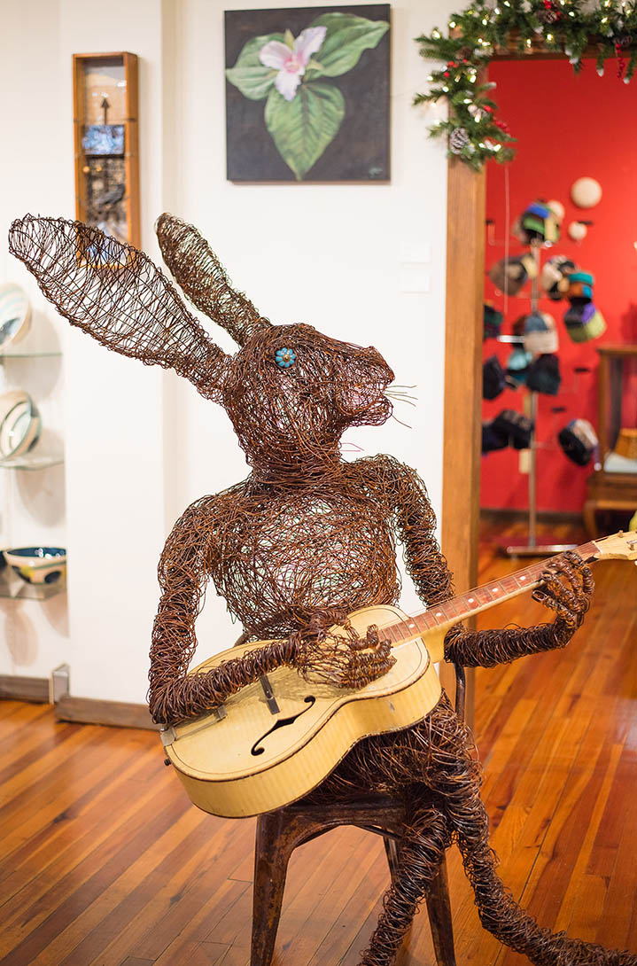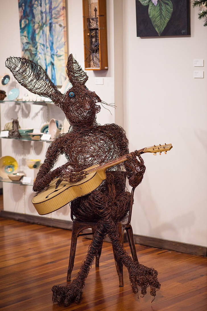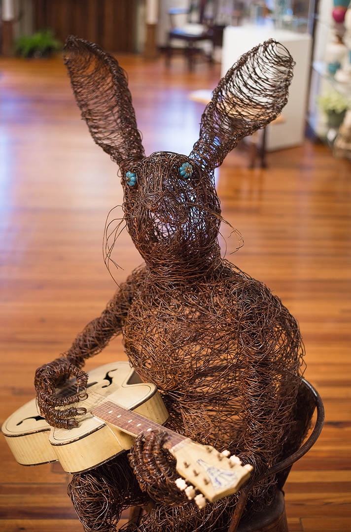 Known for transforming wire into expressive, pen-and-ink–like forms, Coté blends his sculptural creature with authentic found objects, creating a scene that feels both fantastical and rooted in memory. The piece captures the spirit of Coté’s lifelong affection for rabbits—symbols of childhood adventure, imagination, and stories half-remembered from dream and play. Django Reinhare invites viewers into a world where music animates metal, nostalgia sparks magic, and a hare can become a jazz legend.