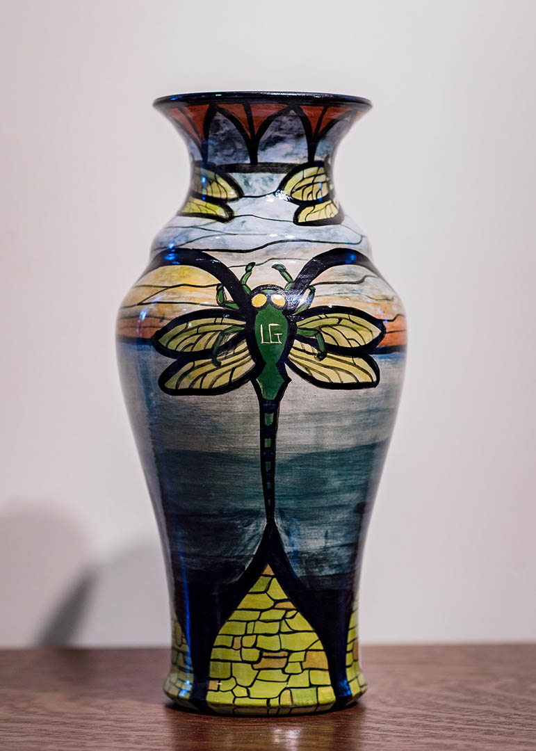 This hand-painted ceramic vase by Roycroft Artisan Leslie Green Guilbault beautifully blends natural elegance with symbolic detail. On one side, a dragonfly features the artist’s own initials at its center—a subtle nod to her personal connection to the work. On the reverse, a second dragonfly carries the iconic Roycroft emblem, honoring the legacy of the Arts and Crafts movement and Guilbault’s place within its living tradition. The clean form of the vase provides a serene backdrop for her painterly linework, allowing the imagery to take center stage.