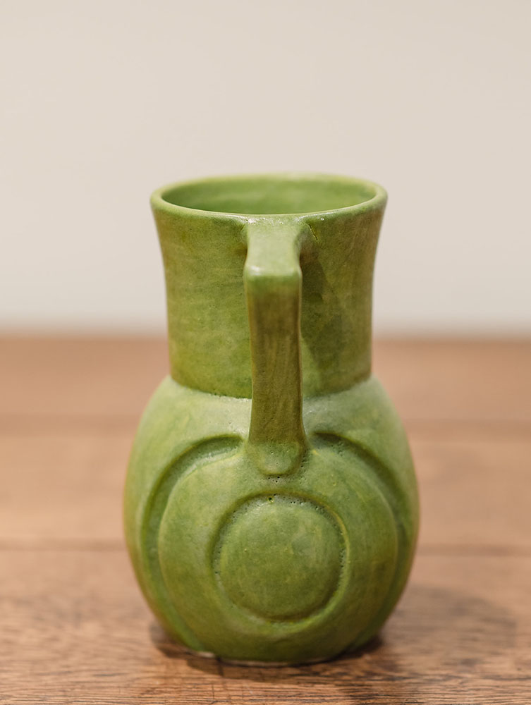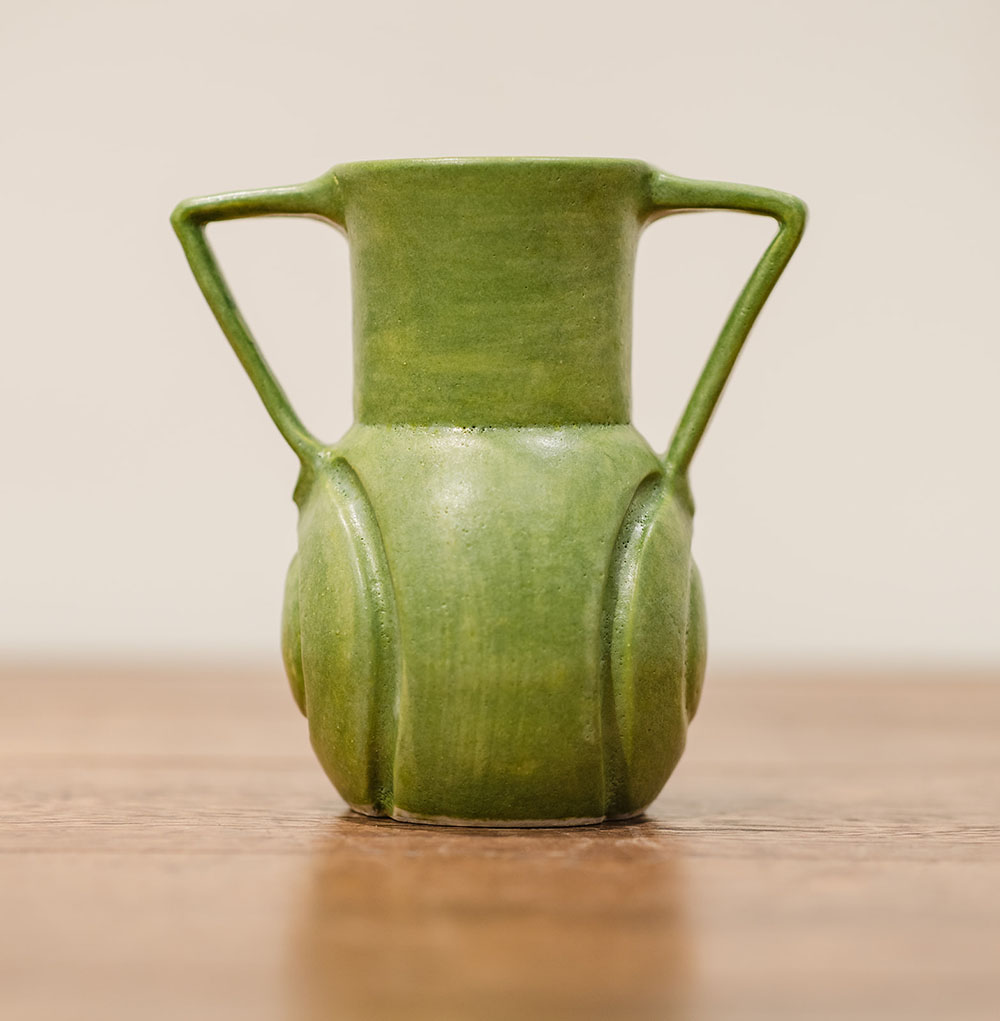 This matte green ceramic vase by Roycroft Artisan Leslie Green Guilbault features a graceful form accented by small handles on either side. The soft, matte glaze enhances the vessel’s sculptural silhouette, giving the piece a quiet elegance that feels both timeless and contemporary.