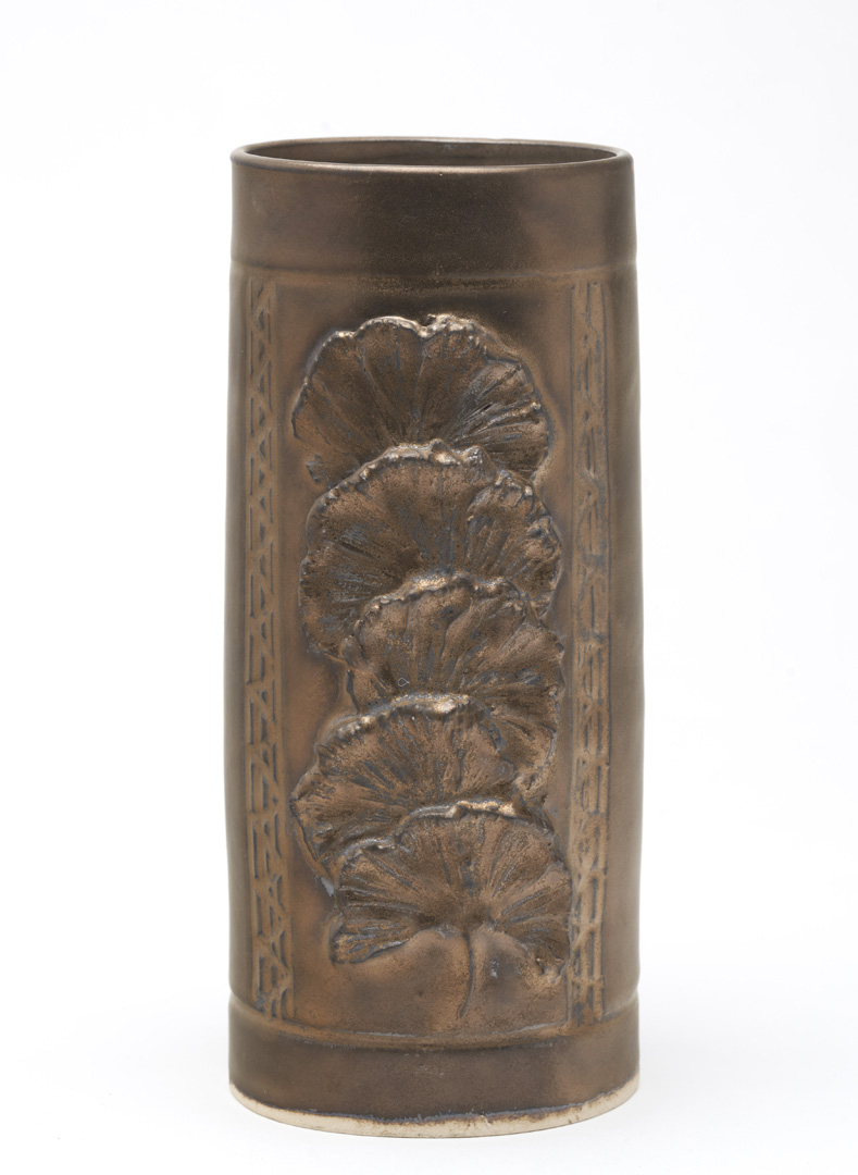This wheel-thrown porcelain vase by Leslie Green Guilbault features a delicate ginkgo leaf design and is part of her Roycroft Metallic Collection. Drawing inspiration from the Arts and Crafts movement, the collection honors the enduring legacy of the Roycrofters—celebrating their commitment to beauty, craftsmanship, and meaningful design.