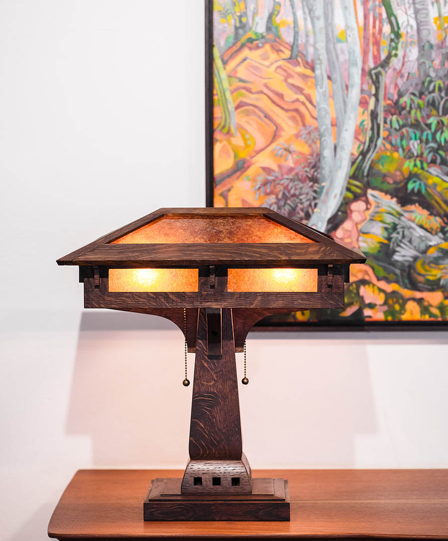 Standing 19 inches tall, the lamp features a beautifully proportioned mica shade that casts a warm, inviting glow across the workspace. Its clean lines and balanced form reflect the Prairie style’s emphasis on simplicity, harmony, and architectural presence.