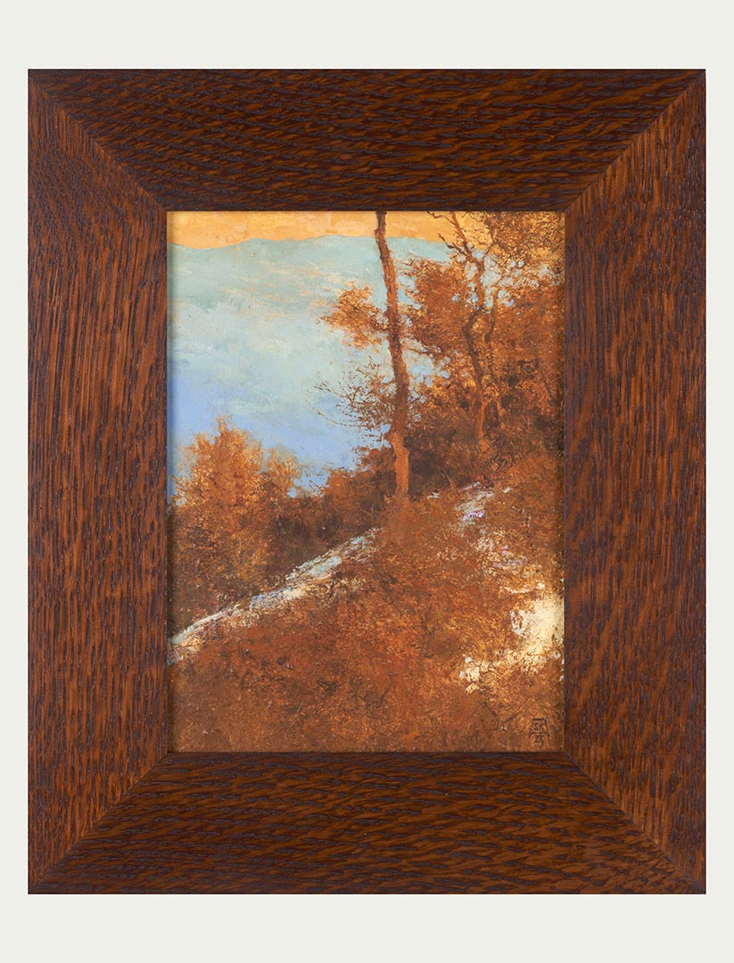 Shawn Krueger’s work focuses on landscapes and scenes in nature and is rooted in the American Arts & Crafts and Tonalist traditions. The majority of his paintings are begun on-site and finished in the studio. Krueger’s landscapes are a perfect complement to the warm woodwork and golden tones of American Arts & Crafts interiors.